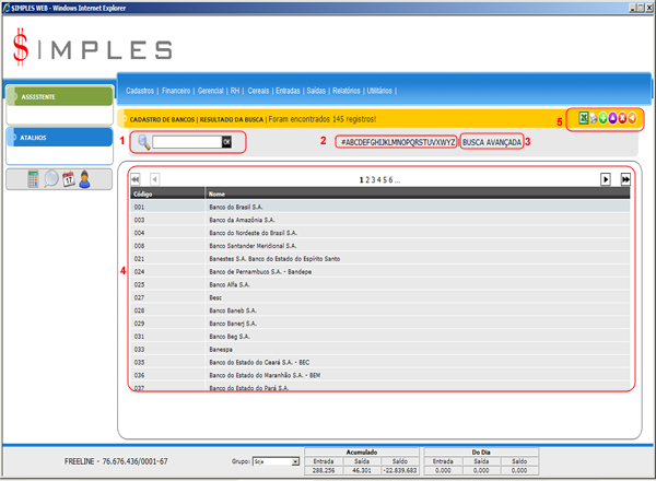 - Grade de Bancos: Mostra todos os Bancos conforme os filtros descritos anteriormente.