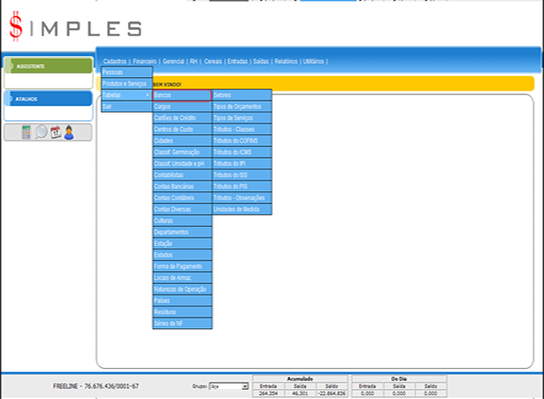 Para acessar o Cadastro de Bancos, use o Menu “Cadastro - Tabelas - Bancos”. Será apresentada a tela principal do Cadastro de Bancos.