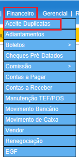 Para acessar Financeiro - Aceite de Duplicatas, use o Menu “ Financeiro – Aceite Duplicatas”
