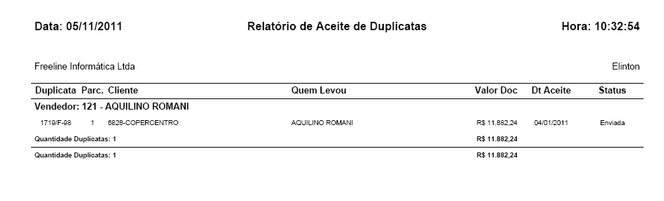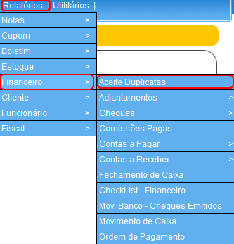 Para acessar este relatório é preciso ir ao Menu “ Relatórios-Financeiro-Aceite Duplicatas”.