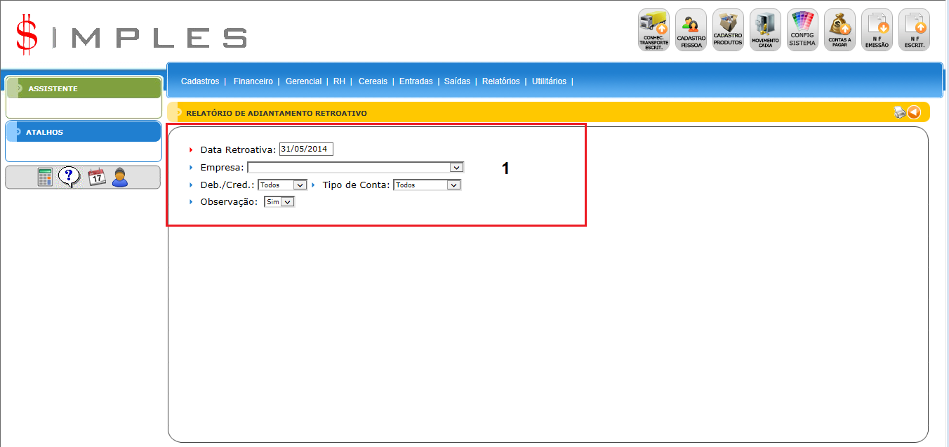 2. Atalhos: Fornece acesso ao Cadastro de Pessoa e ao Movimento de Caixa.