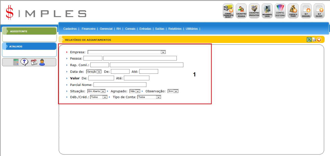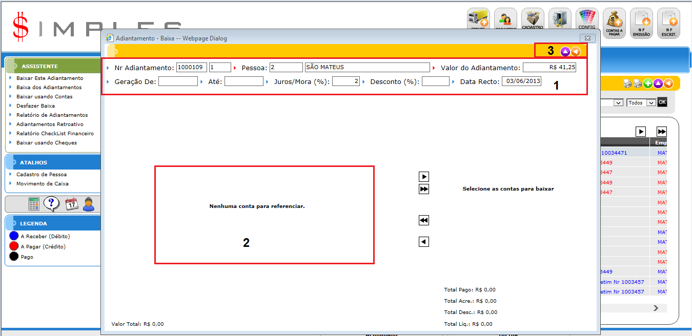 A tela de Adiantamentos possui sete elementos principais que executam funções distintas, conforme seguem: