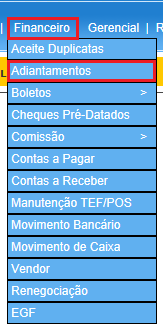 Para acessar o cadastro de Adiantamentos, use o Menu “ Financeiro – Adiantamentos”. Será apresentada a tela principal de Adiantamentos.