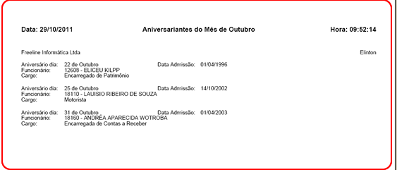 Para acessar este relatório é preciso ir ao Menu “ Relatórios-Funcionário-Aniversariantes”.
