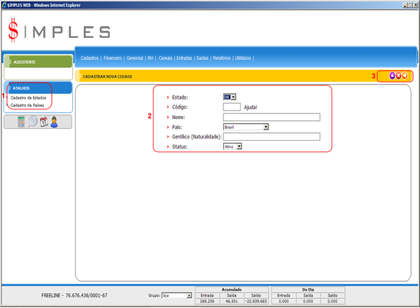 - Atalhos: Permite de forma rápida entrar nos cadastros: Cadastro de Estados e Cadastro de Países.
