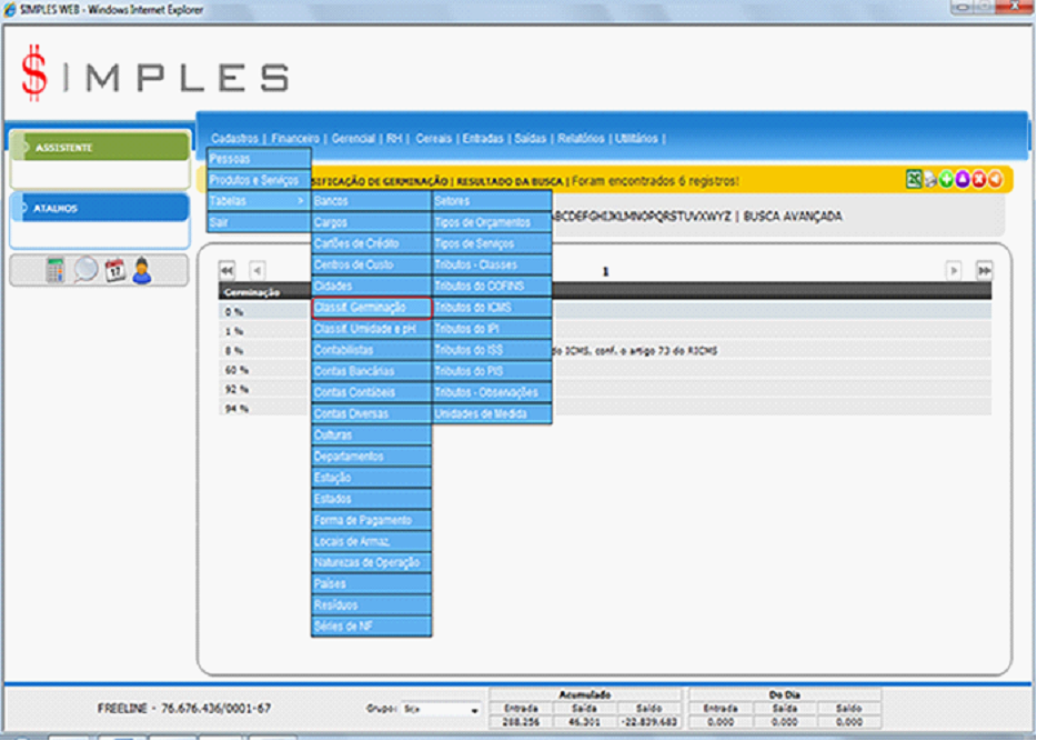 - Pesquisa: Permite executar uma pesquisa usando o percentual de Germinação.