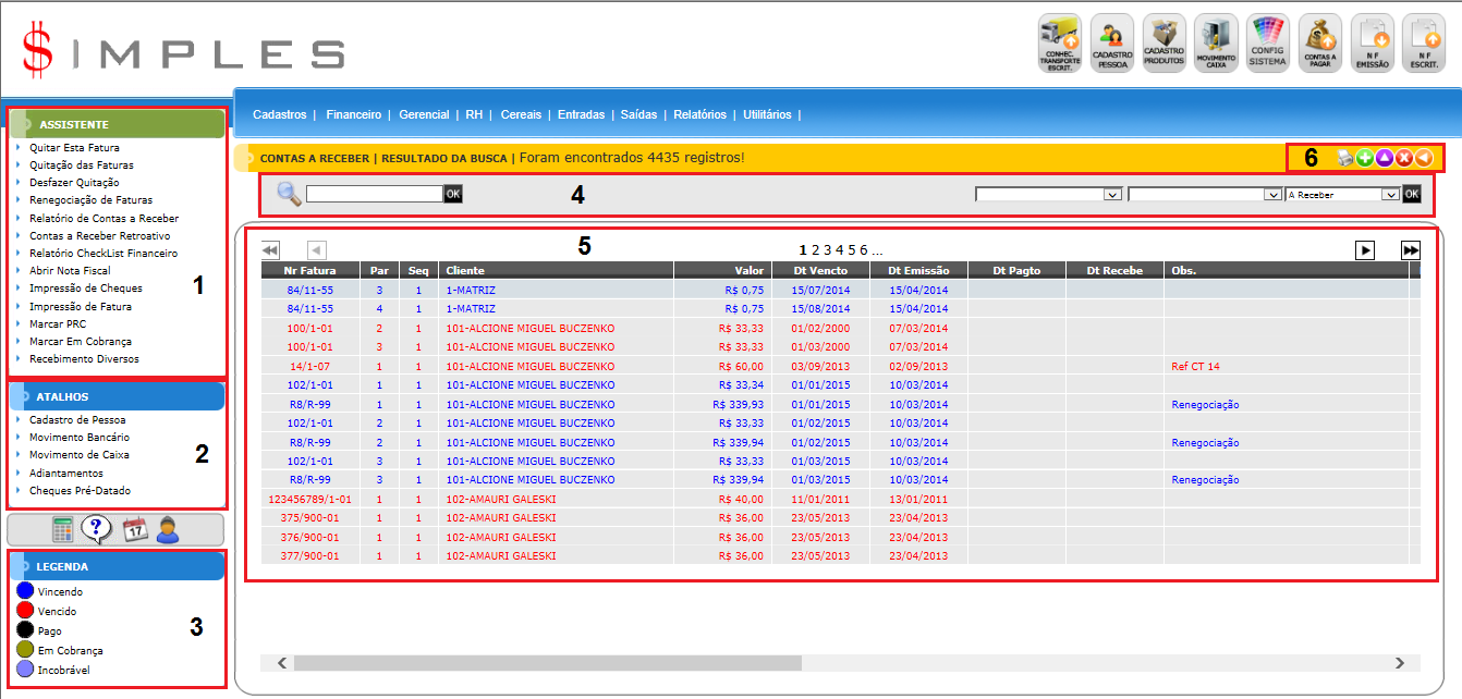 A tela de Financeiro - Contas a Receber - seis elementos principais que executam funções distintas, conforme seguem: