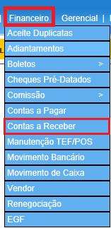 Para acessar Financeiro – Contas a Receber, use o Menu “ Financeiro – Contas a Receber”.