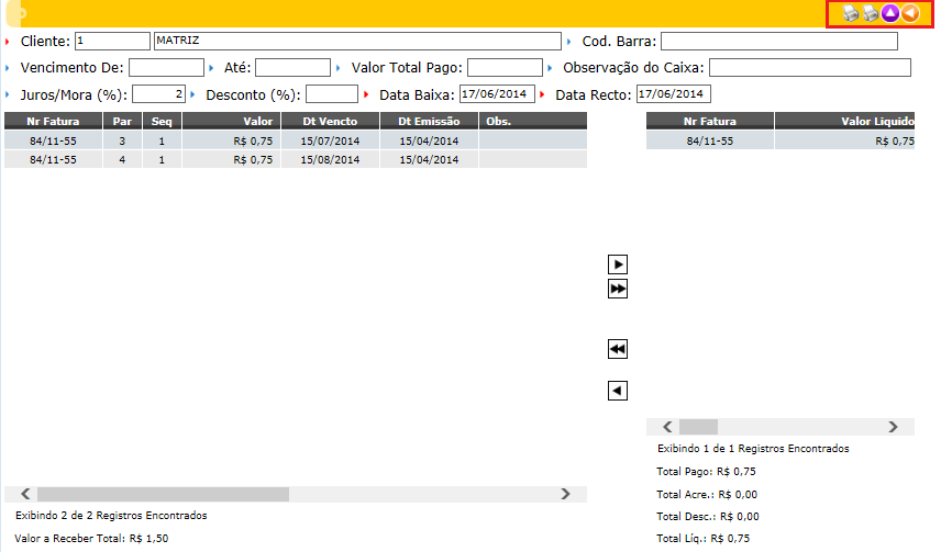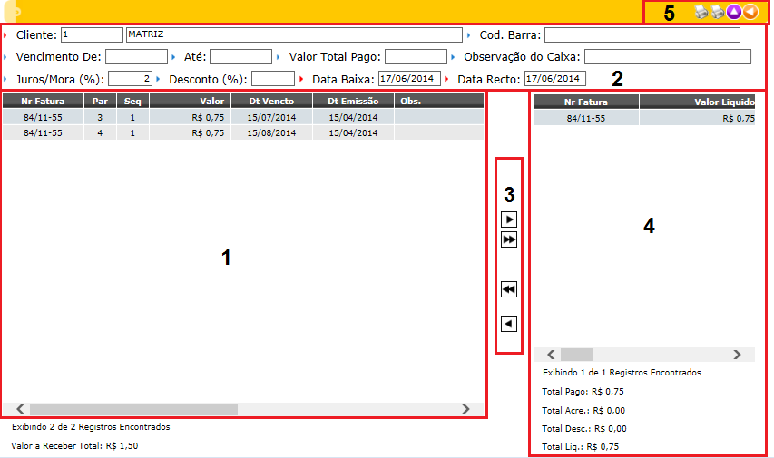 a.1 Navegador: Nesta área se encontra as opçoes de Impressão de cheque, Gerar Recibo, Quitar Fatura e Voltar.