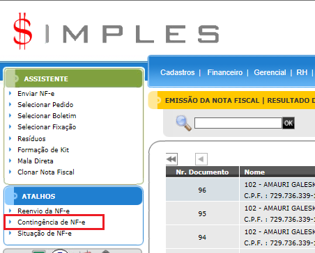 Para ativar a contingência, clique em "Contingência da NF-e" no menu Assistente da tela de Emissão de Nota Fiscal.