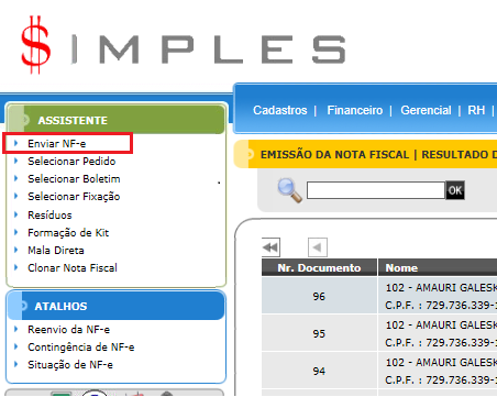 Para fazer o envio de Notas Fiscais Eletrônicas, clique em "Enviar NF-e" no menu Assistente da tela de Emissão de Nota Fiscal.