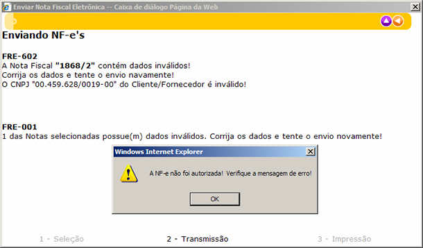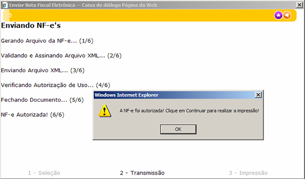 Na terceira fase, o sistema iniciará a transmissão do lote com as NF-es selecionadas. Nesta fase poderão ocorrer problemas de comunicação, seja por problemas na internet ou na própria SEFAZ. Neste caso o processo será abortado também mas não poderá ser reiniciado. Neste caso o usuário deverá acessar a opção de Reenvio da NF-e para corrigir o problema.