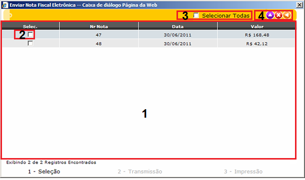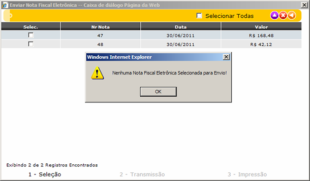 Caso o usuário não selecionou ao menos uma NF na grade, uma mensagem será apresentada.