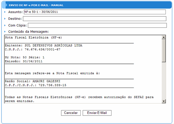 A tela de Envio de Nota Fiscal Eletrônica possui quatro elementos principais que executam funções distintas, conforme seguem: