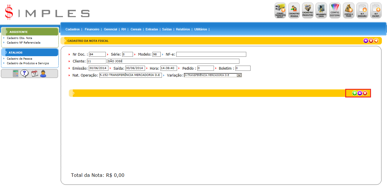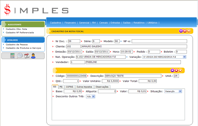 Em seguida após dar o Enter, para confirmar os itens, é só digitar a quantidade e confirmar, logo que confirmado irão aparecer outros campos referentes aos impostos. O sistema irá sugerir os valores, caso não esteja de acordo com os valores que deseja é só alterar.