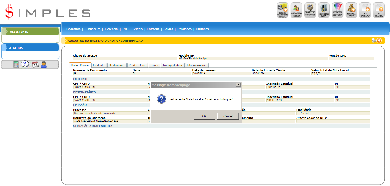 Em seguida ao preencher os dados do transporte, vai ser exibida a tela que mostra todos os dados da nota e depois é só clicar no botão de imprimir e depois aparecerá uma tela pedindo para atualizar o estoque.
