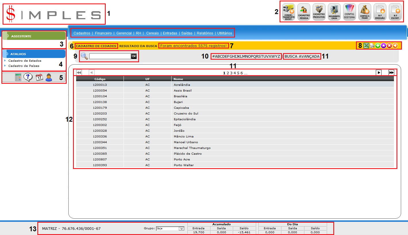 13) Rodapé: apresenta os dados da filial que se está logado. Adiconalmente pode apresentar outras dados conforme a configuração da instalação.
