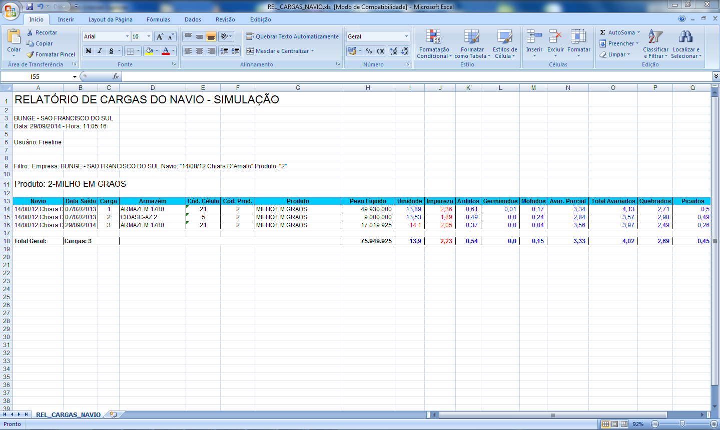 - Clicando no ícone do excel na lista de remessas será mostrado um relatório em excel.
