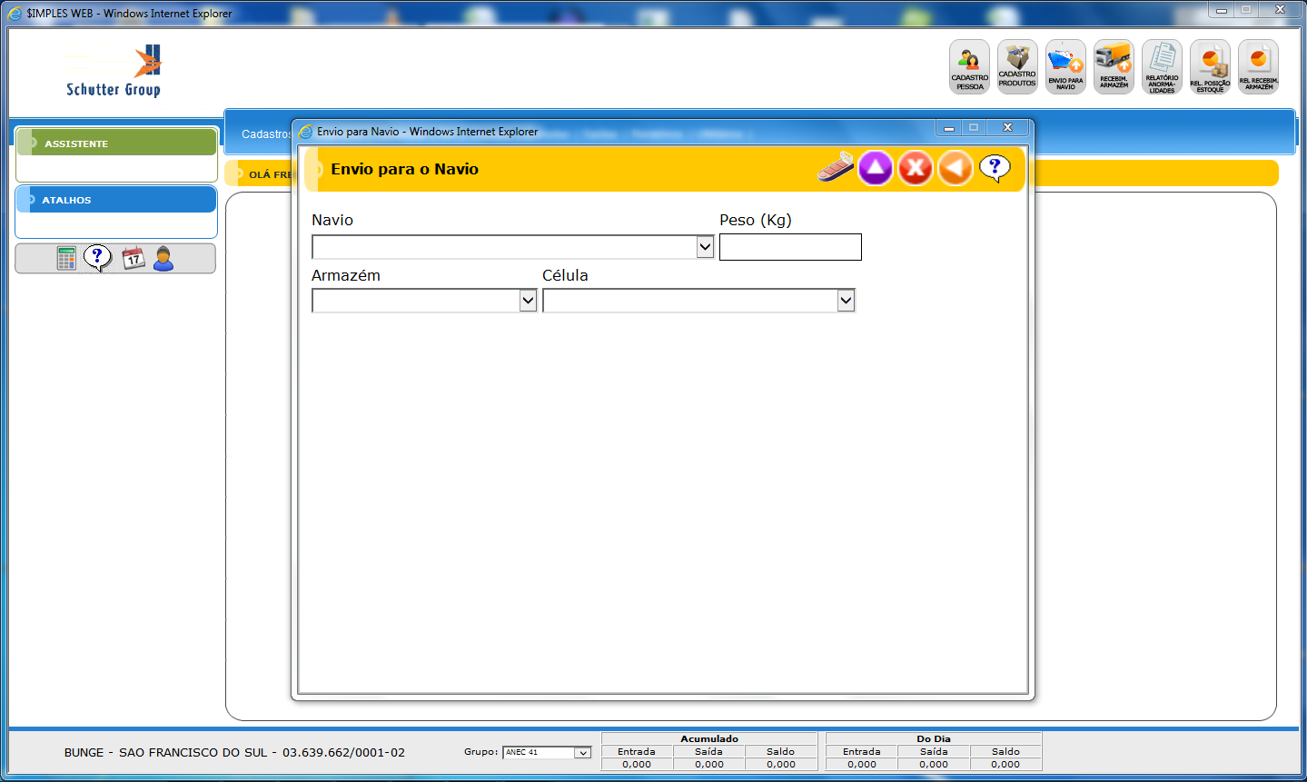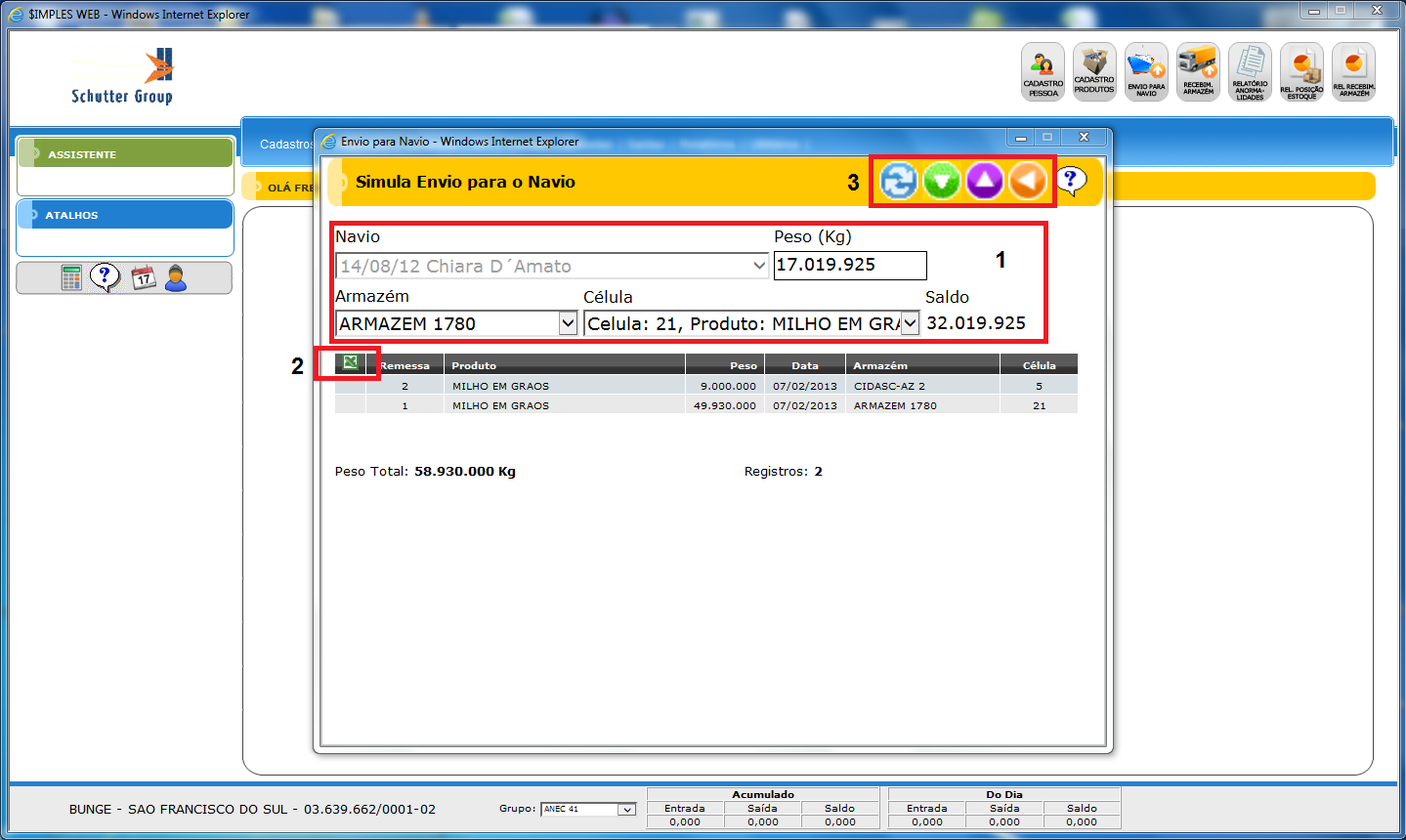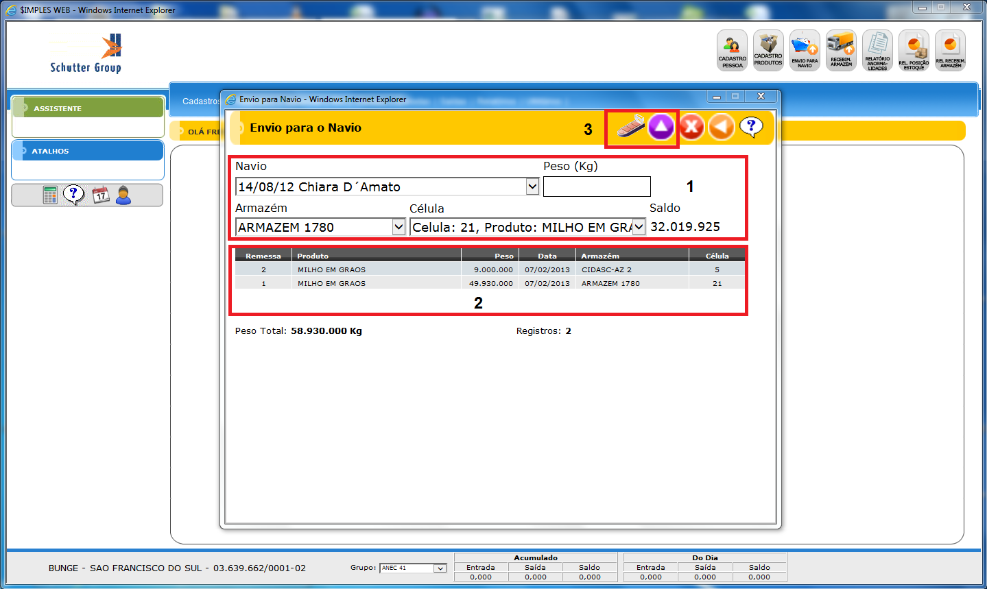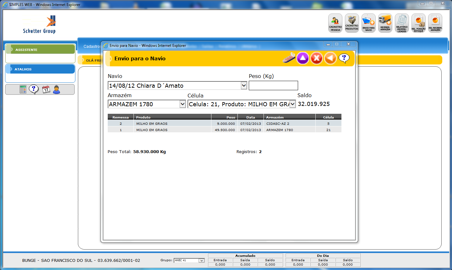 - Preenchimento das informações do navio, peso, armazém e célula. Ao final será mostrado o saldo total do pesso dos produtos nas remessas.