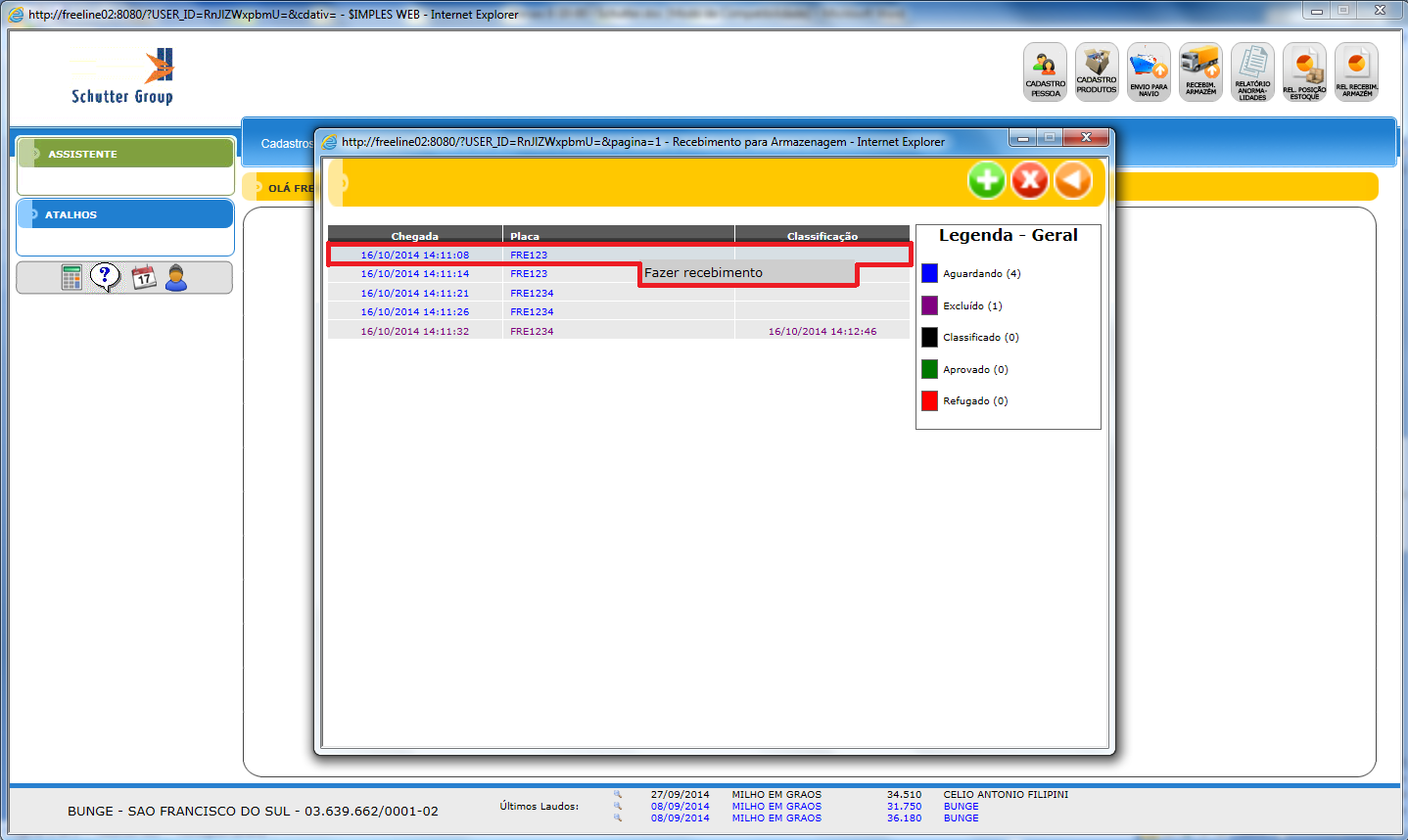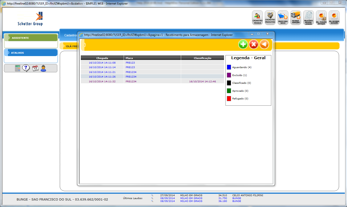 A tela mostra os veículos que estão pendentes ou que foram atendidos no dia (seja para serem classificados, refugados ou excuídos), mostrando a situação atual desta carga com um sistema de cores, conforme legenda na própria tela.