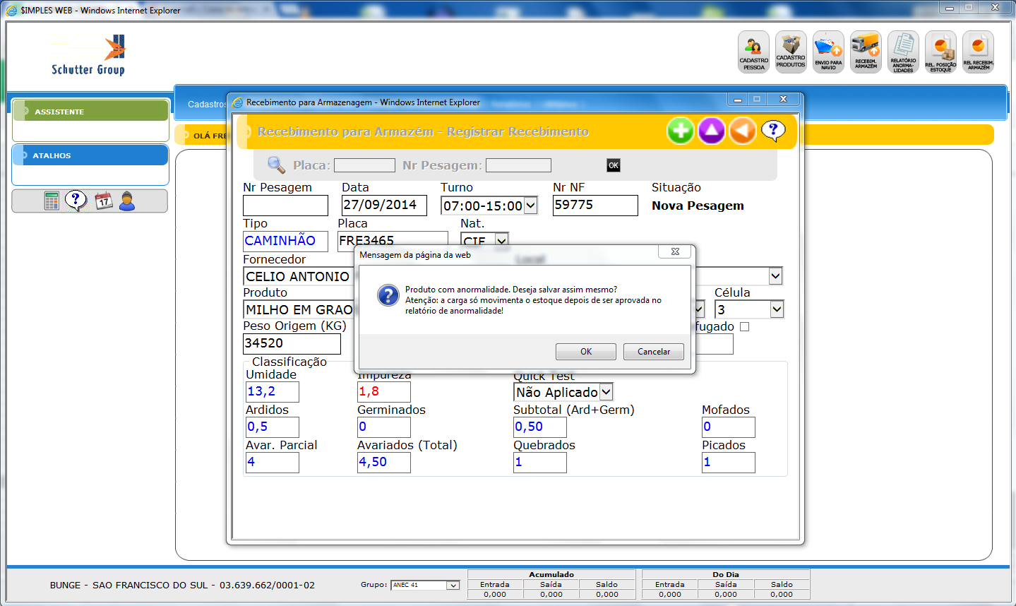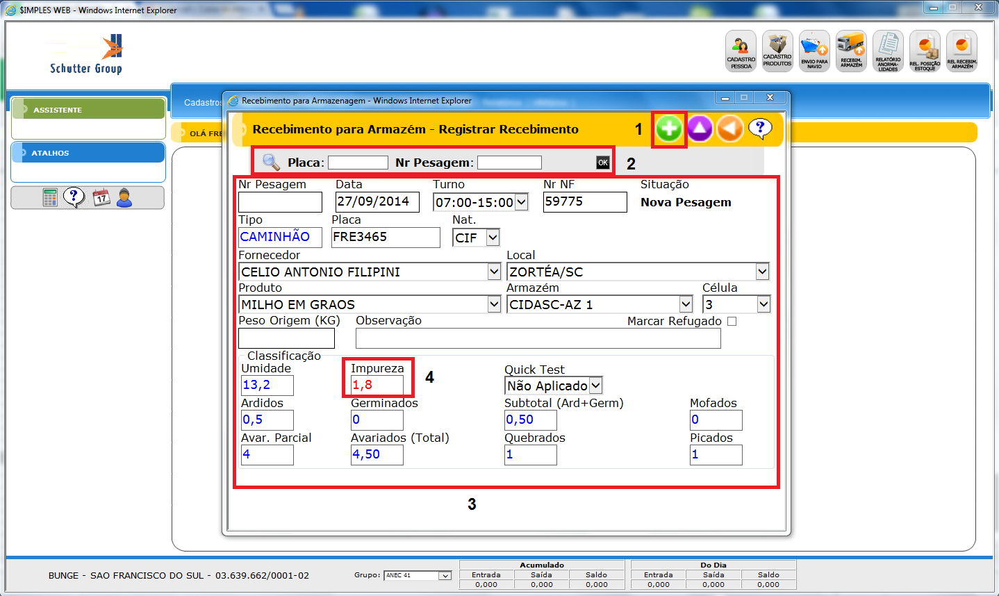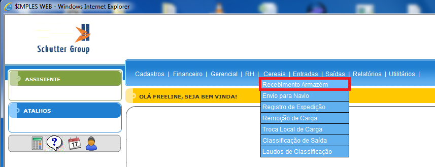 Para acessar Recebimento Armazém , use o Menu “Cereais –Recebimento Armazém”.