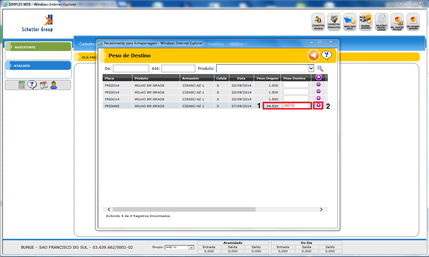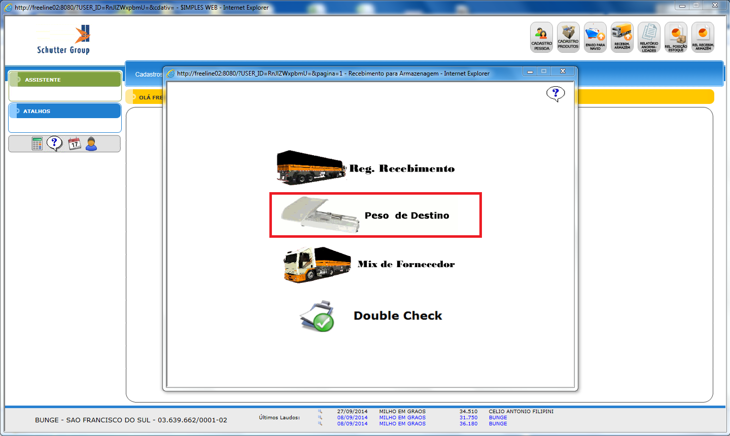Para registrar o peso de destino clique na segunda opção do menu Recebimento Armazém - "Cereais - Recebimento Armazém - Peso de Destino"
