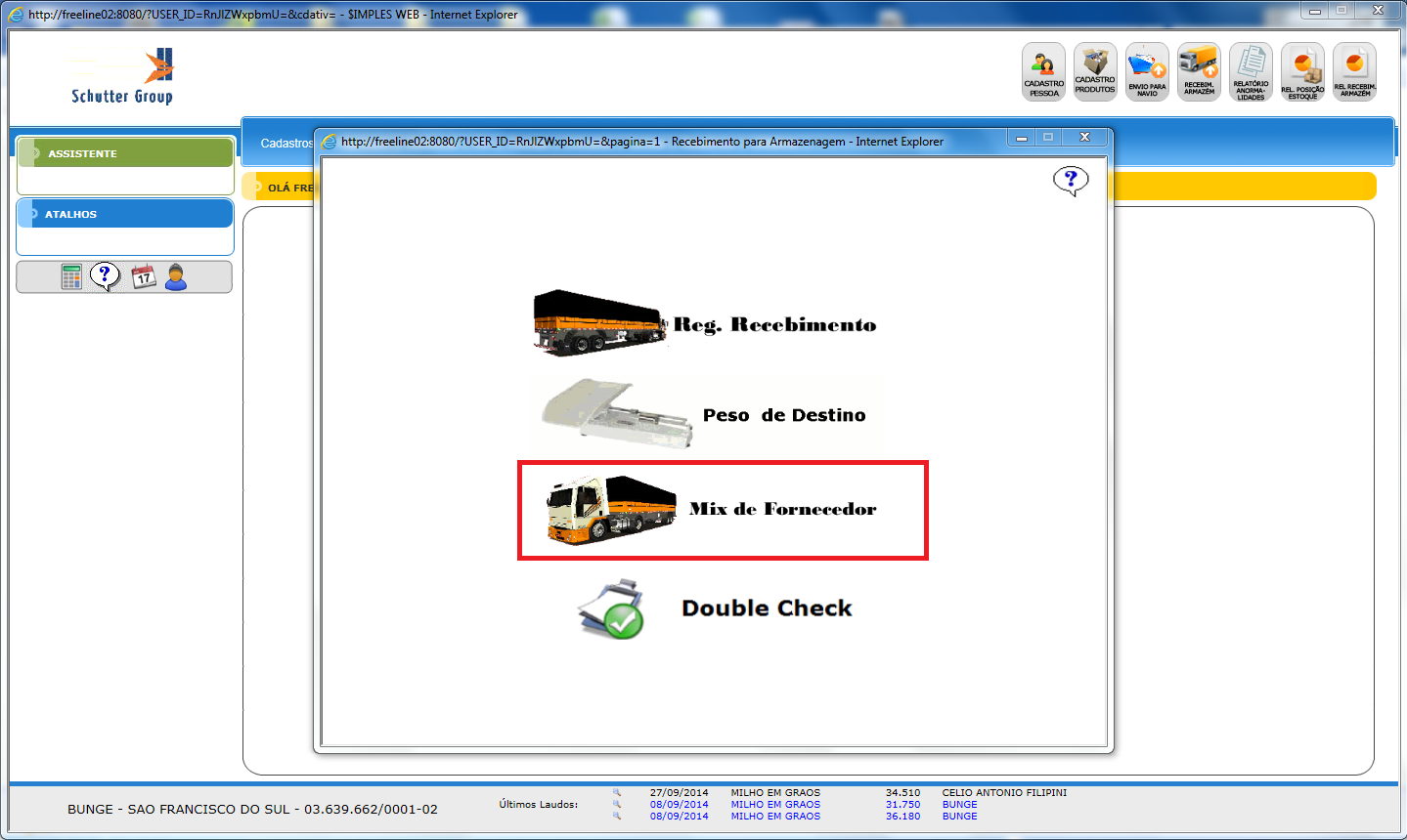 Para acessar o Mix de Fornecedor clique na terceira opção do menu Recebimento Armazém - "Cereais - Recebimento Armazém - Mix de Fornecedor"