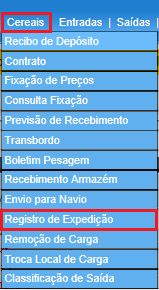 Para acessar Cereais - Registro de Expedição , use o Menu “Cereais – Registro de Expedição”.