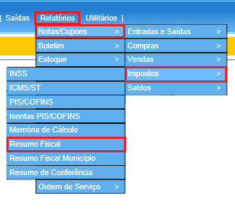 Para acessar este relatório é preciso ir ao Menu “ Relatórios-Notas/Cupons-Impostos-Resumo Fiscal”.