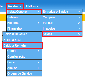 Para acessar este relatório é preciso ir ao Menu “ Relatórios-Notas/Cupons-Saldos-Saldo a Remeter”.