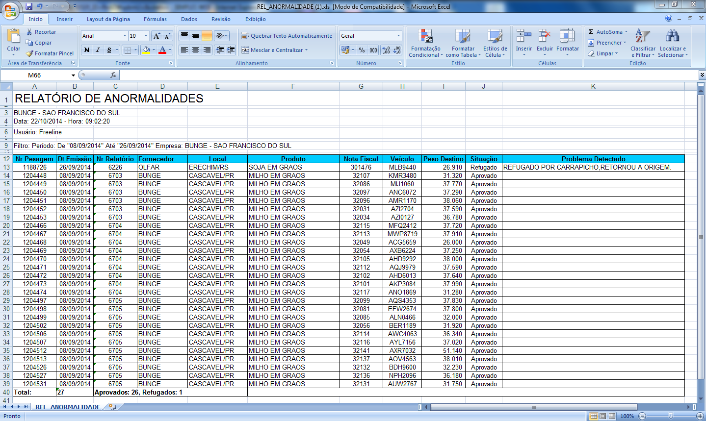 Será exibido um relatório listando as cargas com anormalidade e a situação de cada uma.