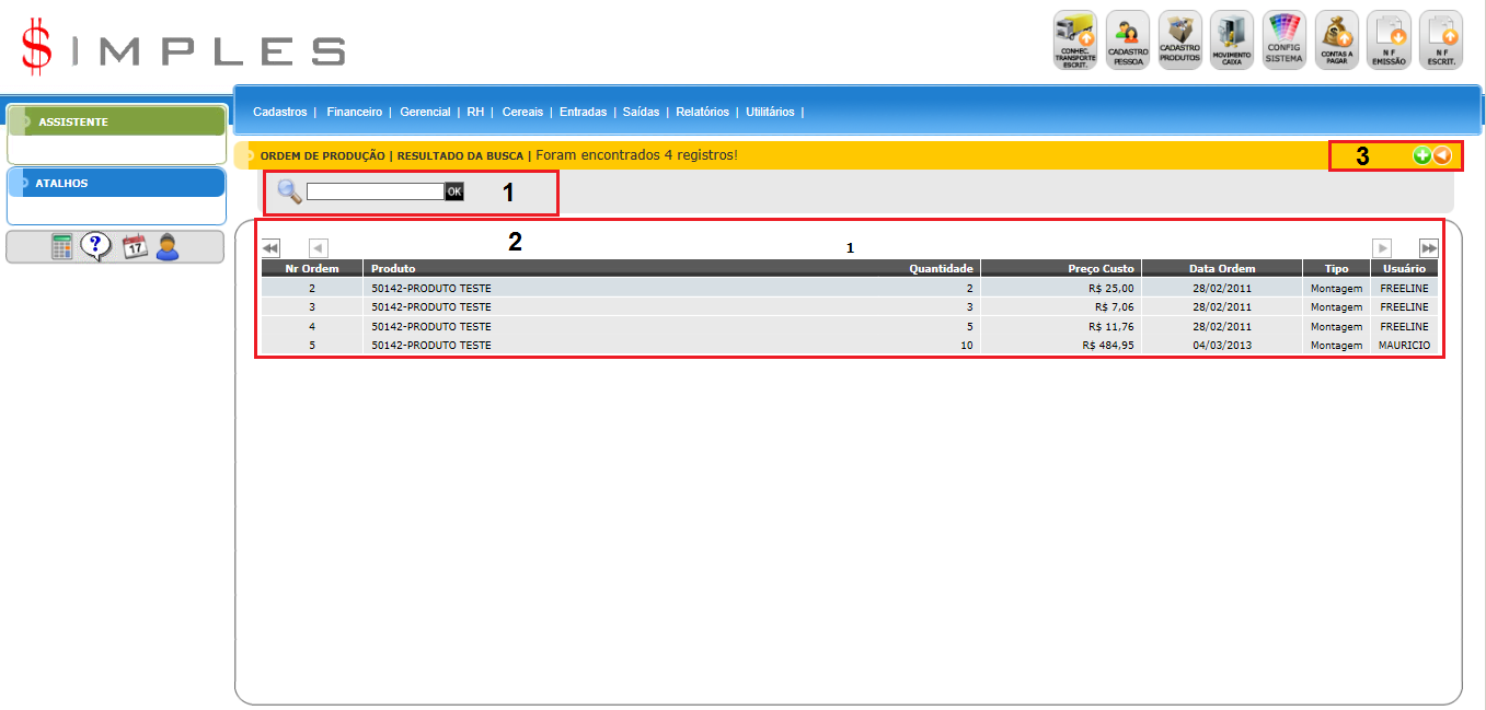 - A tela Ordem de Produção possui três elementos principais que executam funções distintas, conforme seguem: