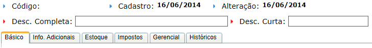 O cadastro de produtos apresenta seis abas, dentre elas estão Básico, Informações Adicionais, Estoque, Impostos, Gerencial e Históricos.