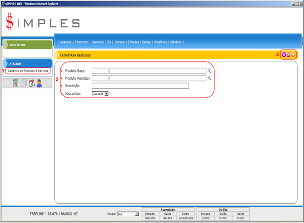 A tela do Cadastro de Resíduos possui cinco elementos principais que executam funções distintas, conforme seguem: