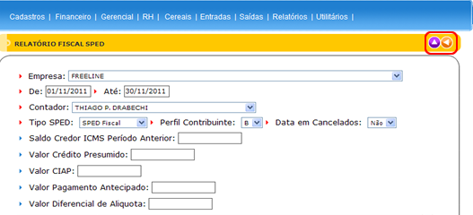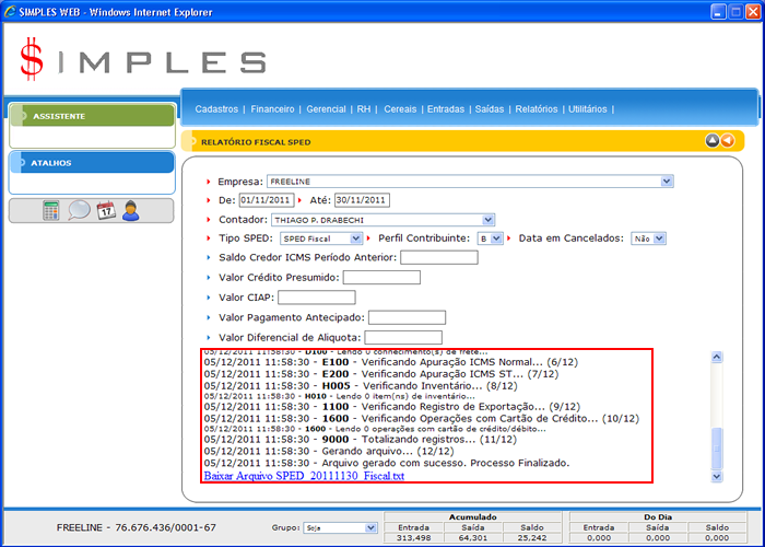 Terá possibilidade de ser gerado o arquivo de texto do SPED clicando no ícone “Gerar Arquivo” do navegador.