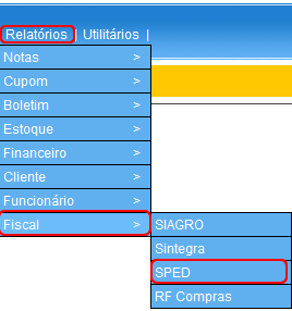 Para acessar este relatório é preciso ir ao Menu “ Relatórios-Fiscal-SPED”.