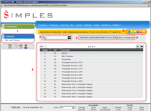 A tela do Cadastro de Tributos do ICMS possui seis elementos principais que executam funções distintas, conforme seguem: