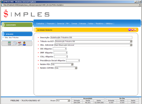 - Obs. dos Tributos: Atalho para o cadastro de Observações dos Tributos.